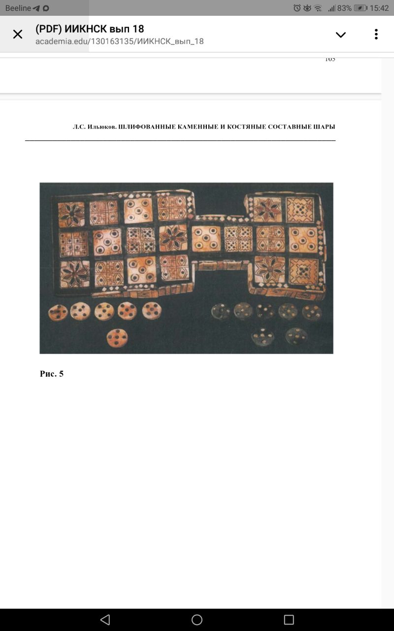 «В 2023 г. в курганном могильнике Аглицкий I в Аксайском районе Ростовской области в ходе раскопок археолога Веры Ларенок в подкурганном погребении около погребенного скорченного на правом боку был обнаружен комплекс предметов, предназначенный для игры (рис. 2). В его изголовье находились два остродонных горшка, два кремневых нуклеуса и каменный утюжок. Перед лицом погребенного была положена кожаная "игральная доска" (рис. 3).