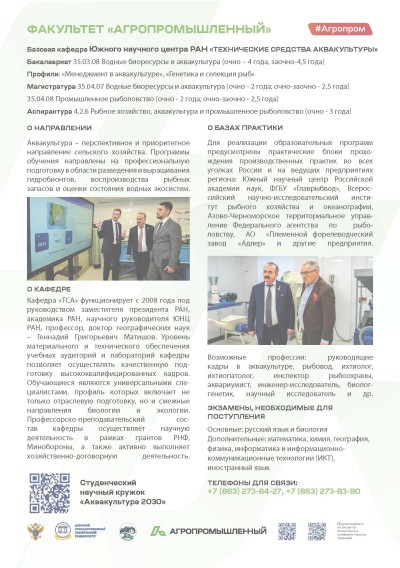Базовая кафедра ЮНЦ РАН «Технические средства аквакультуры» факультета «Агропромышленный» в Донском государственном техническом университете приглашает абитуриентов для поступления: