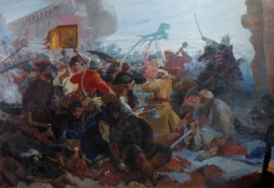 На фото: портрет Гермогена; картина Е.В. Ильина «Героическая оборона Смоленска от польской шляхты».