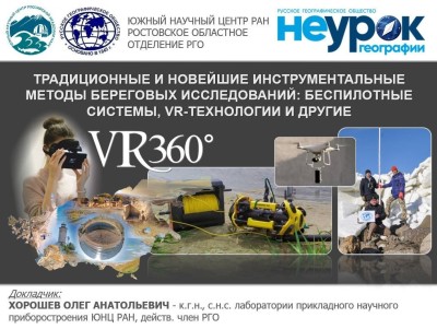 «На слёте в рамках масштабного проекта РГО "НЕурок географии. Путешествуй и открывай" я рассказал собравшимся о традиционных и новейших инструментальных методах береговых исследований (беспилотных системах, иммерсивных технологиях, георадарах и др.), активно используемых специалистами ЮНЦ РАН в научных экспедициях. Кроме того, начинающим экологам и их наставникам были продемонстрированы образцы научного оборудования, а также полученные с их помощью визуальные и контактные данные об окружающей среде, собранные, в том числе, в процессе проведения недавней экспедиции ЮНЦ РАН под эгидой РГО по малым рекам и лиманам Северо-Восточного Приазовья».