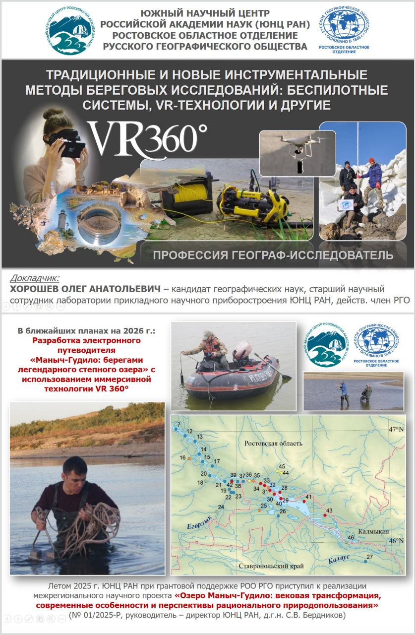 «На лекции в Институте наук о Земле ЮФУ я рассказал о традиционных и новых инструментальных методах береговых исследований, которые активно применяются географами, геоэкологами, биологами ЮНЦ РАН и ИНоЗ ЮФУ в полевых работах. Мне довелось познакомить студентов-географов с отдельными результатами экспедиционных проектов, реализуемых Центром при поддержке Русского географического общества и охватывающих берега Азовского моря и низовья его малых рек, Нижний Дон, а также древний морской пролив между Каспийским и Чёрным морями – Кумо-Манычскую впадину. Поделился информацией о ходе выполнения межрегионального научного проекта под эгидой РГО "Озеро Маныч-Гудило: вековая трансформация, современные особенности и перспективы рационального природопользования", экспедиционный этап которого мы реализуем в настоящее время».