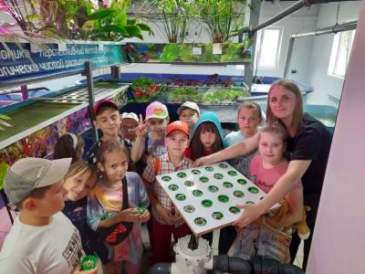 На фото: Т. Польшина проводит экскурсию и мастер-класс по посеву семян в аквапонику для учеников 2-х классов.
