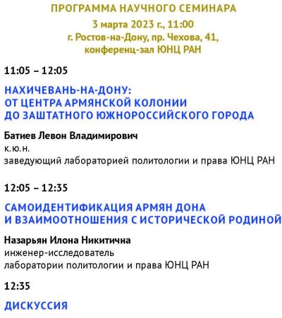 Научный семинар «Армянская община Нижнего Дона: история и современное состояние», 03 марта 2023 г. в 11.00 в ЮНЦ РАН . #ДесятилетиеНауки