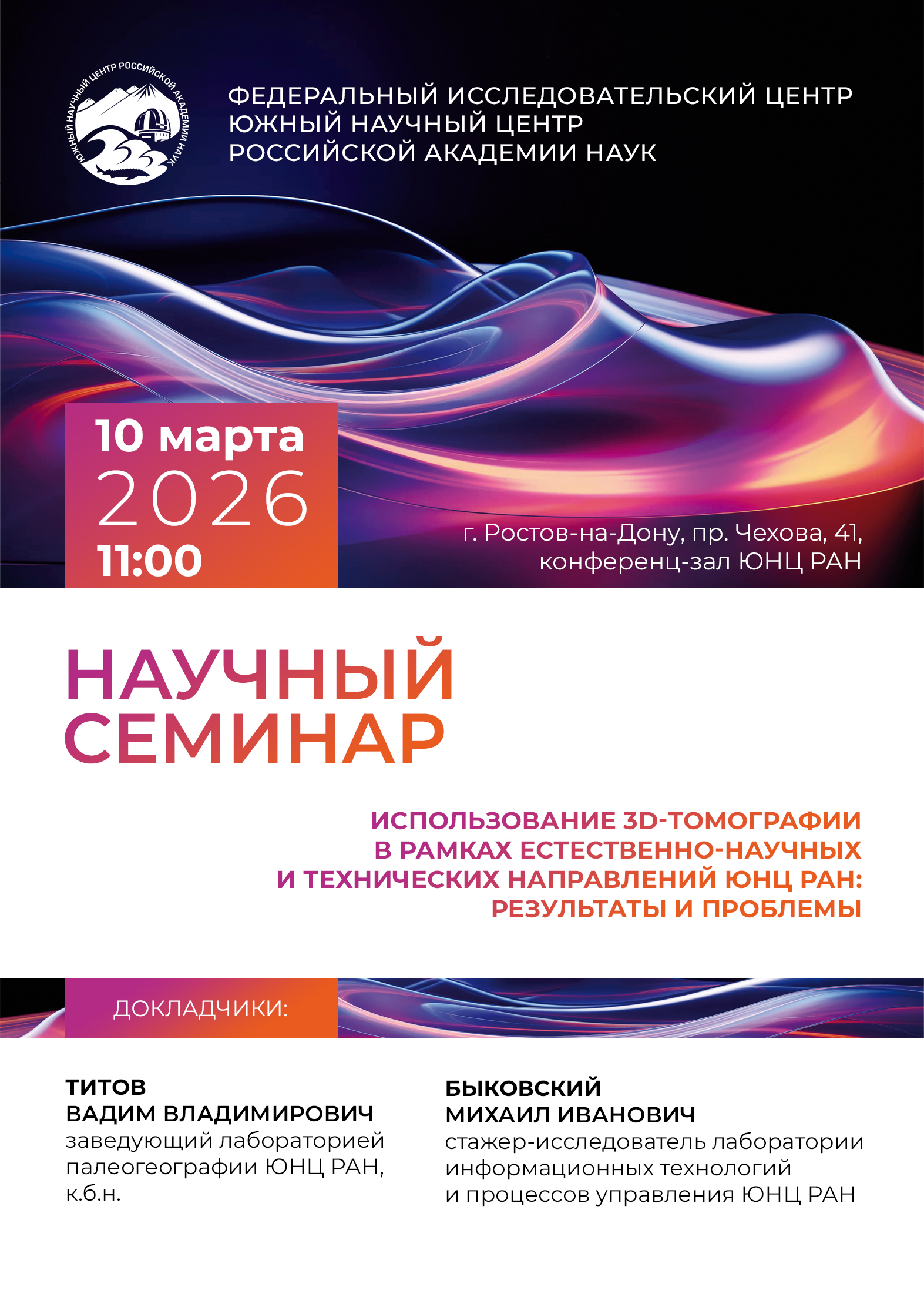“Использование 3D-томографии в рамках естественно-научных и технических направлений ЮНЦ РАН: результаты и проблемы”, 10 марта 2026 г. в 11.00