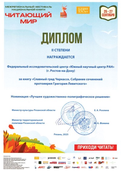 ЮНЦ РАН награждён дипломом II степени XI Межрегионального фестиваля национальной книги «Читающий мир» (г. Рязань) за книгу «Славный град Черкасск. Собрание сочинений протоиерея Георгия Левитского».