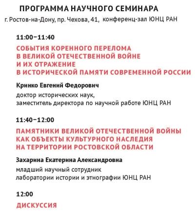 доктор исторических наук Евгений Кринко («События коренного перелома в Великой Отечественной войне и их отражение в исторической памяти современной России») и младший научный сотрудник ЮНЦ РАН Екатерина Захарина («Памятники Великой Отечественной войны как объекты культурного наследия на территории Ростовской области»).