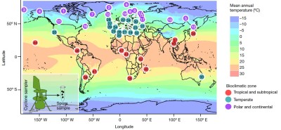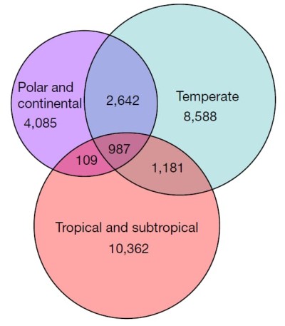 «Чтобы получить комплексное представление о пространственной и сезонной динамике грибов, был использован метод отбора и молекулярно-генетического анализа грибных спор, переносимых по воздуху. Такой подход оказался эффективным инструментом для изучения разнообразия грибов в различных средах обитания. В рамках Глобального проекта в течение двух лет в 47 местах на открытом воздухе по всему миру (за исключением Антарктиды) производился отбор проб спор (рисунок 1). В результате метагеномного анализа образцов было получено 27 954 оперативных таксономических единицы на уровне видов, достоверно относящихся к грибам (рисунок 2). Подавляющее большинство таксономических единиц было обнаружено только в пределах одной климатической зоны (рисунок 3), а пространственно-временные закономерности видового богатства и состава сообществ в основном объяснялись среднегодовой температурой воздуха. В тропических регионах наблюдалось наибольшее разнообразие грибов, за исключением лишайниковых, эрикоидных микоризных и эктомикоризных грибов, которые достигли своего пика в регионах с умеренным климатом. Гиперразнообразное царство грибов следует глобальной высокоспециализированной пространственной и временной динамике, при этом сезонность как в видовом богатстве, так и в составе сообществ увеличивается с увеличением широты.