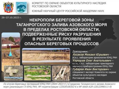 В наш доклад вошли итоги экспедиционных выездов ЮНЦ РАН в 2020–2023 годах в пределах береговой зоны Таганрогского залива Азовского моря. Мы рассказали, в том числе, о тревожной ситуации, связанной с выявлением 8 некрополей различных эпох (кладбищ и воинских захоронений), подверженных риску частичного или полного разрушения в результате воздействия штормовых нагонов морских вод, абразионных и оползневых процессов. Также мы выразили свою обеспокоенность разрушением данных объектов исторической памяти, а также ознакомились с интересными практиками изучения и спасения старинных погостов в различных уголках нашей страны».