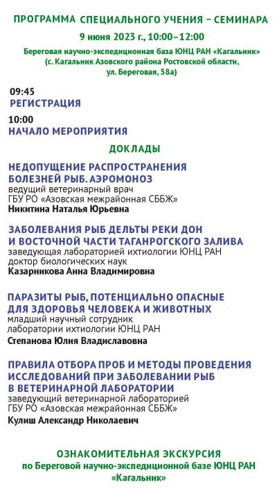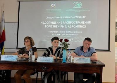 9 июня на береговой научно-экспедиционной базе «Кагальник» ЮНЦ РАН состоялся семинар «Недопущение распространения болезней рыб. Аэромноз». Инициатором выступила Азовская межрайонная станция по борьбе с болезнями животных.