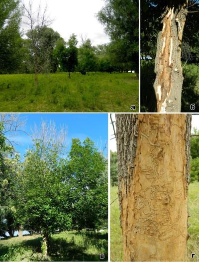 б – следы зарастания на поражённом участке ствола; в – суховершинное дерево; г – личиночные ходы златки на поверхности древесины усохшего ясеня.