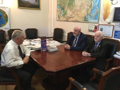 Директор Комплексного НИИ РАН (г. Грозный), академик Академии наук ЧР Дена Батаев и главный научный сотрудник АН ЧР, доктор технических наук Хасан Мажиев встретились с директором ЮНЦ РАН, доктором географических наук Сергеем Бердниковым и заместителем Президента РАН, научным руководителем ЮНЦ РАН, академиком Геннадием Матишовым и обсудили перспективы сотрудничества.