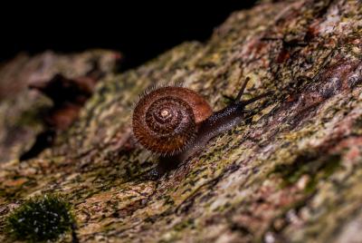 2020 год. Обитатель Адыгеи в верховьях реки Сюк, вид называется Pseudotricha rubiginosa или Волосатая ржавая улитка. На фото - молодая особь, взрослые особи этого вида имеют диаметр раковины не более 1 см.