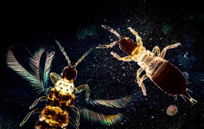 2019 год. Bolothrips cingulatus вид трипсов длина тела которых около 2 мм. Постоянный препарат. Косое освещение, которое дает темнопольный конденсор, подсвечивает с боку не только крылья трипсов с тончайшими структурами, но и мельчайшие частички в растворе, в котором они находятся. Эти частички и придают фото ощущение космоса.