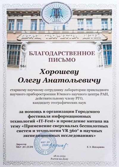 «В рамках митапа я познакомил ребят старшей возрастной группы с особенностями и опытом применения сверхмалых беспилотных систем и любимой мной технологии VR 360° в научных экспедиционных исследованиях ЮНЦ РАН, проводимых в рамках реализации государственного задания и научных проектов, поддержанных РГО. Судя по вопросам, которые обсуждали с молодой аудиторией, начинающие исследователи уже серьёзно разбираются в программировании, знакомы со многими передовыми разработками, имеют опыт создания интересных приложений.