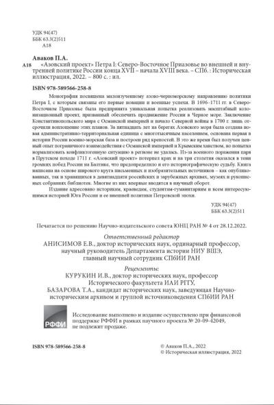 Аваков П.А. «Азовский проект» Петра I: Северо-Восточное Приазовье во внешней и внутренней политике России конца XVII — начала XVIII века. — СПб.: Историческая иллюстрация, 2022. — 800 с.