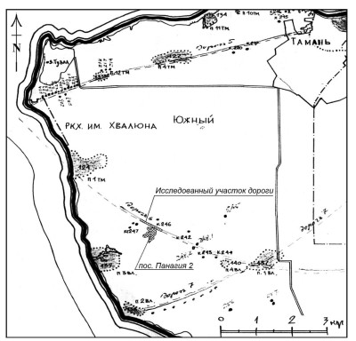 «Впервые на Таманском полуострове археологически исследован участок древней дороги большой протяжённости. Его расположение полностью совпало с намеченной ранее по данным аэрофото- и космоснимков трассой древней дороги, что подтвердило перспективность использования этих методов в изучении инфраструктуры полуострова и достоверность полученных результатов. Характер рельефа, говорящий об использовании дороги, ведущей к древней переправе через Керченский пролив в качестве скотопрогонной трассы, позволяет предположить регулярный (сезонный?) перегон стад между Таманским и Крымским полуостровами».