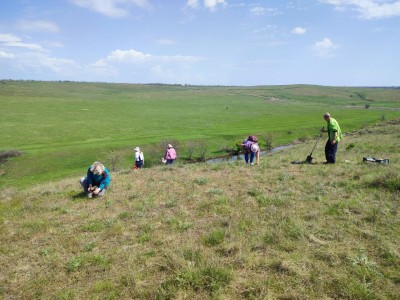 На фото: авторы статьи, а также склоны балки Широкой в период массового цветения степного разнотравья.